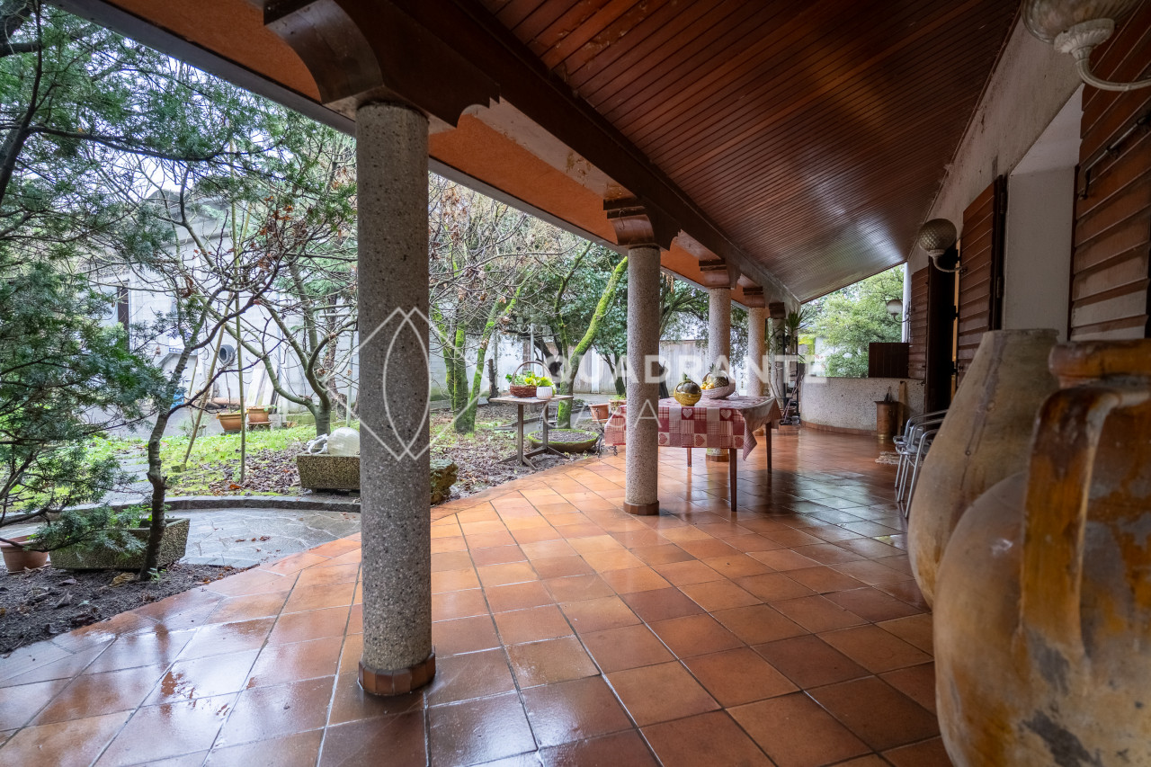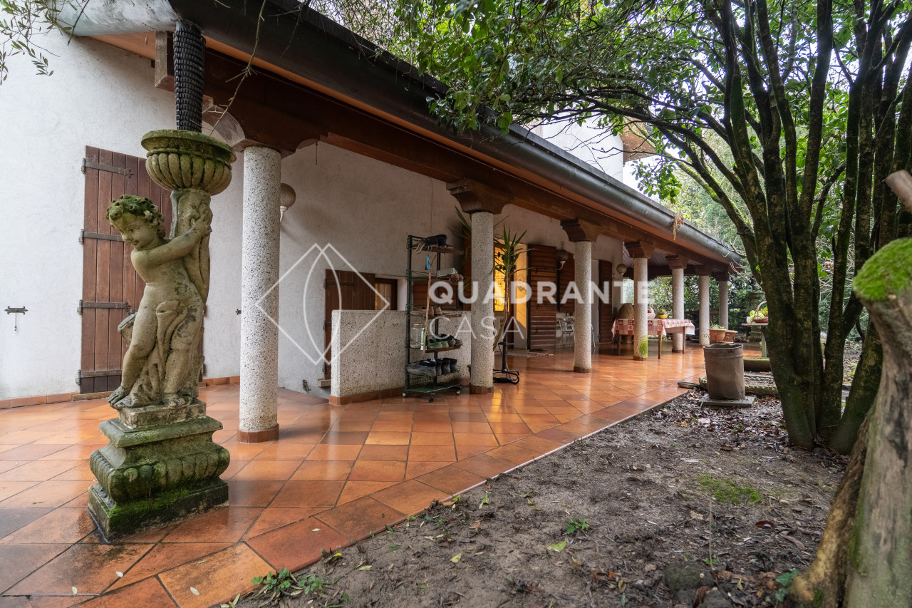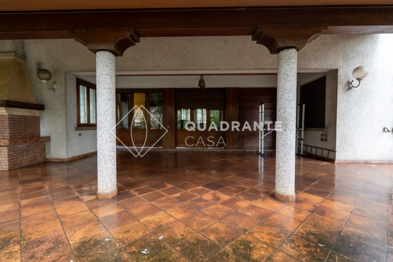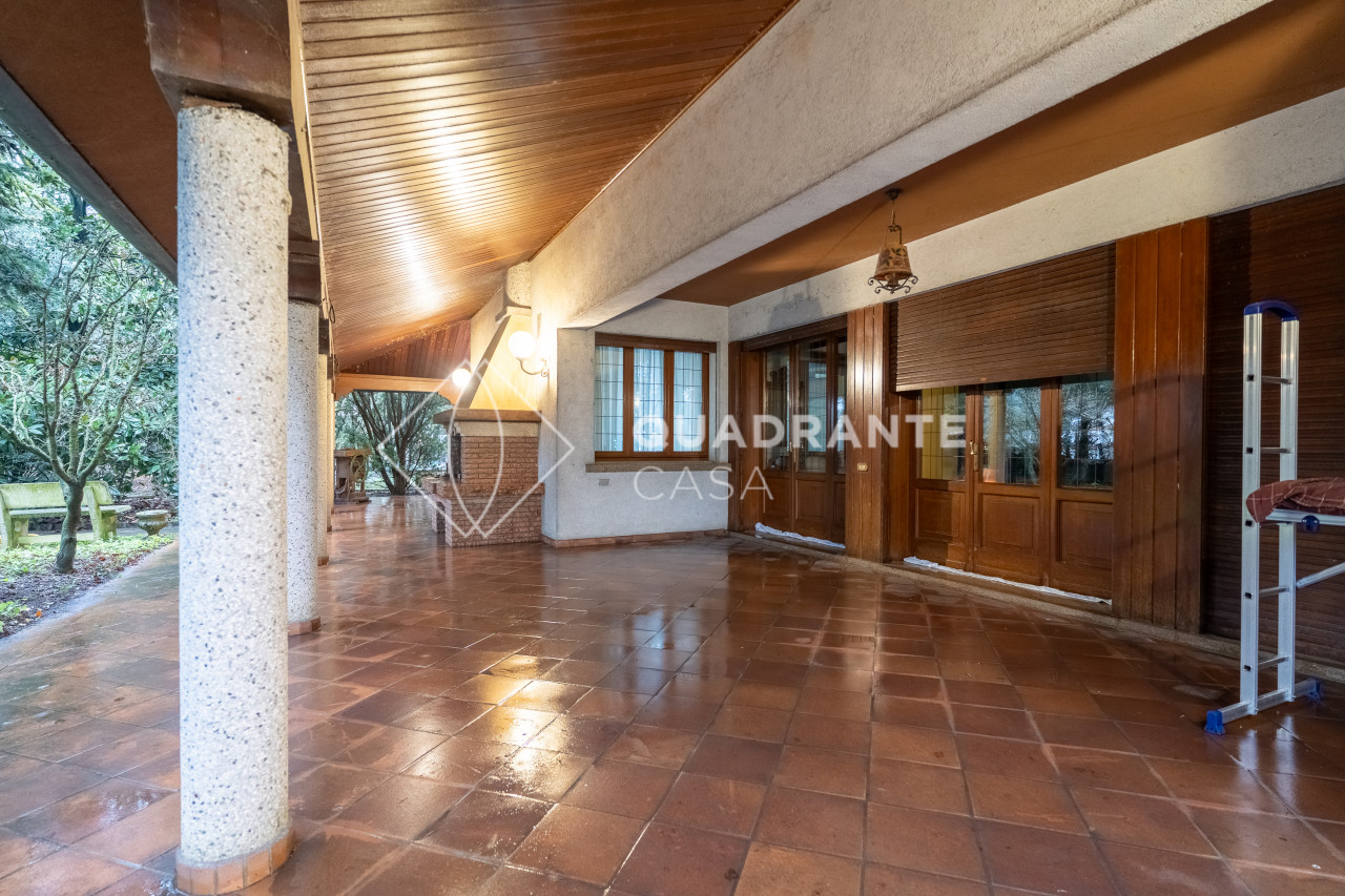 Un grande porticato abitabile, dotato di caminetto corre sui due lati principali dell'abitazione, accompagnando al'ingresso della Villa, dove ci accoglie, su un livello leggermente rialzato, un elegante salotto di rappresentanza con camino centrale.