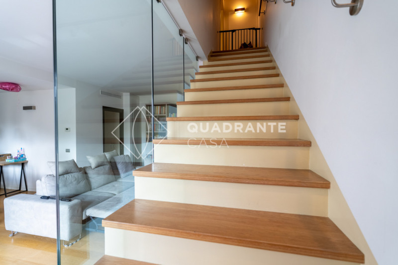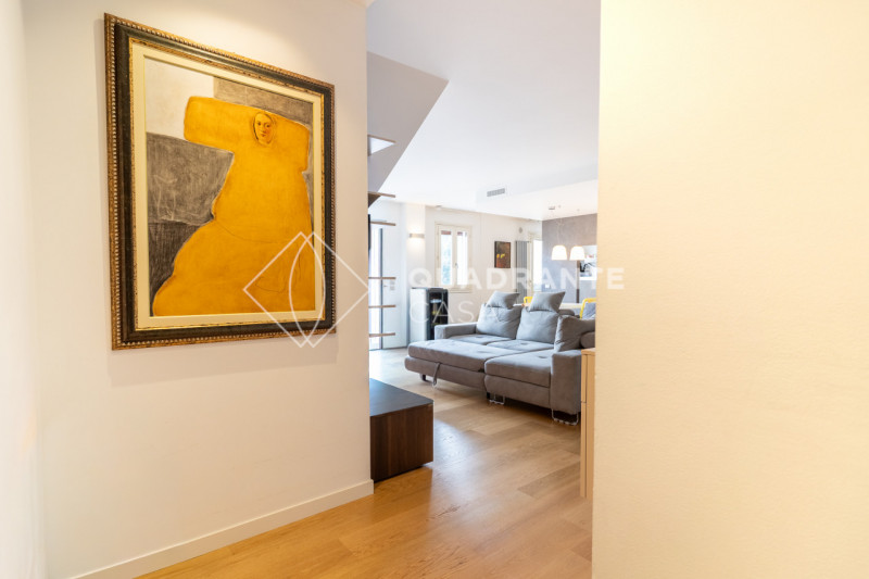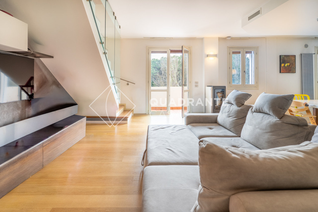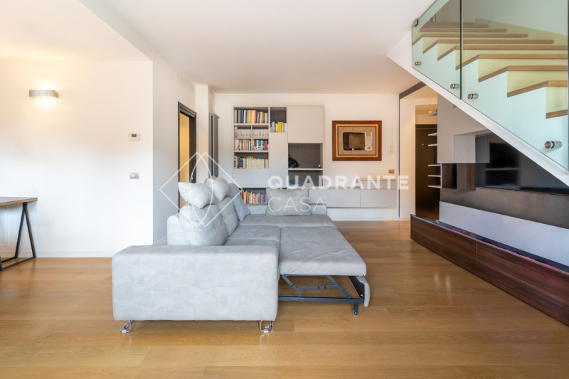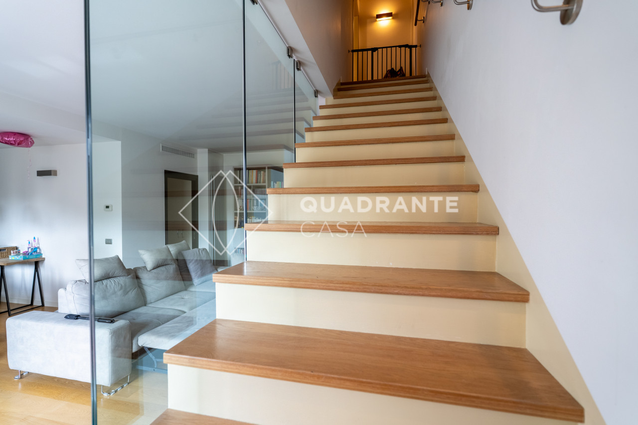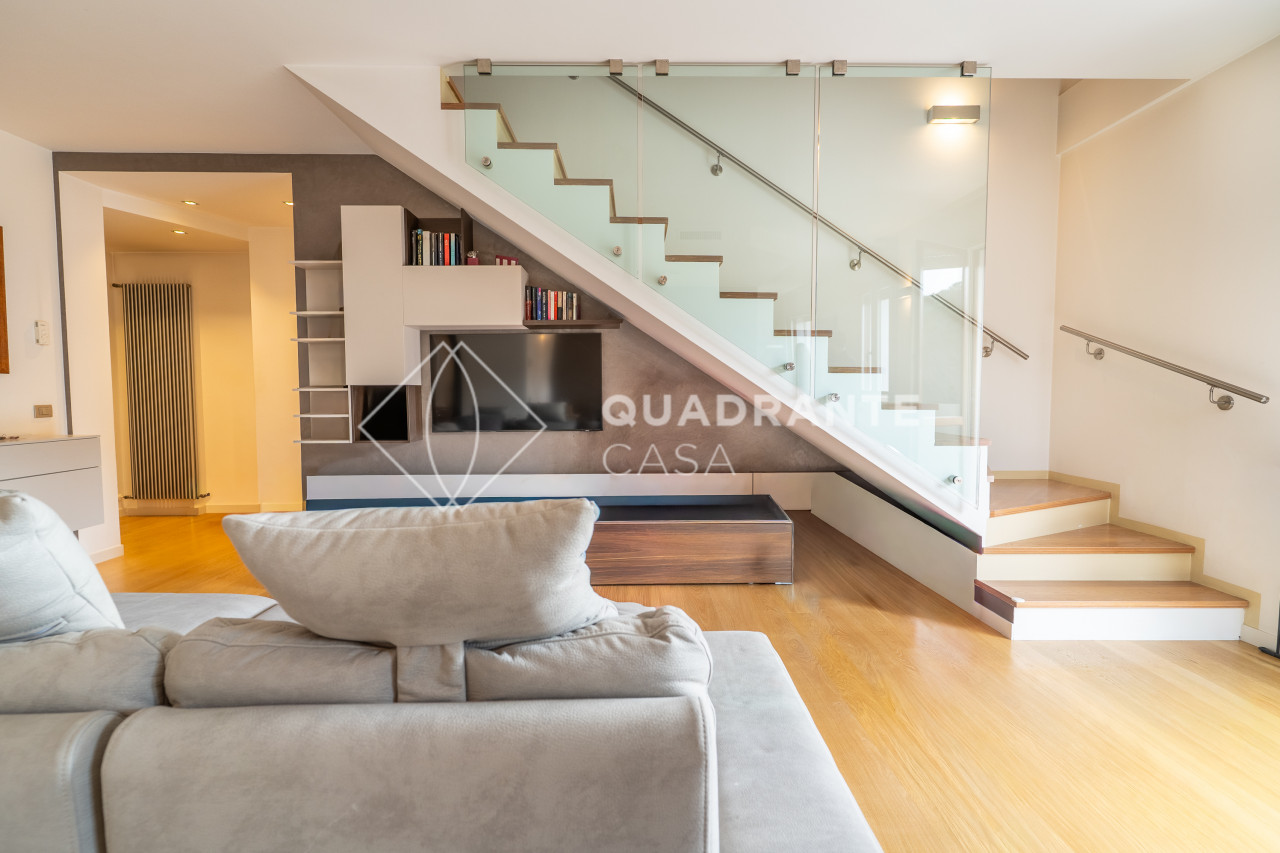 L’appartamento si distingue per gli ambienti luminosi e moderni: il soggiorno open space è caratterizzato da ampie vetrate che affacciano su una zona verdeggiante, pavimentazione in parquet chiaro e una raffinata scala interna con parapetto in vetro. La zona living è arricchita da arredi su misura ed elementi di design contemporaneo che donano eleganza all’ambiente.