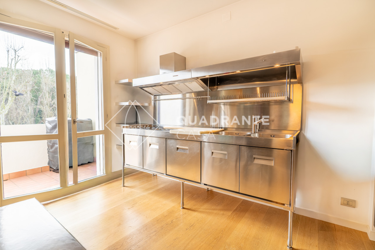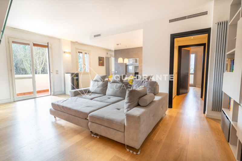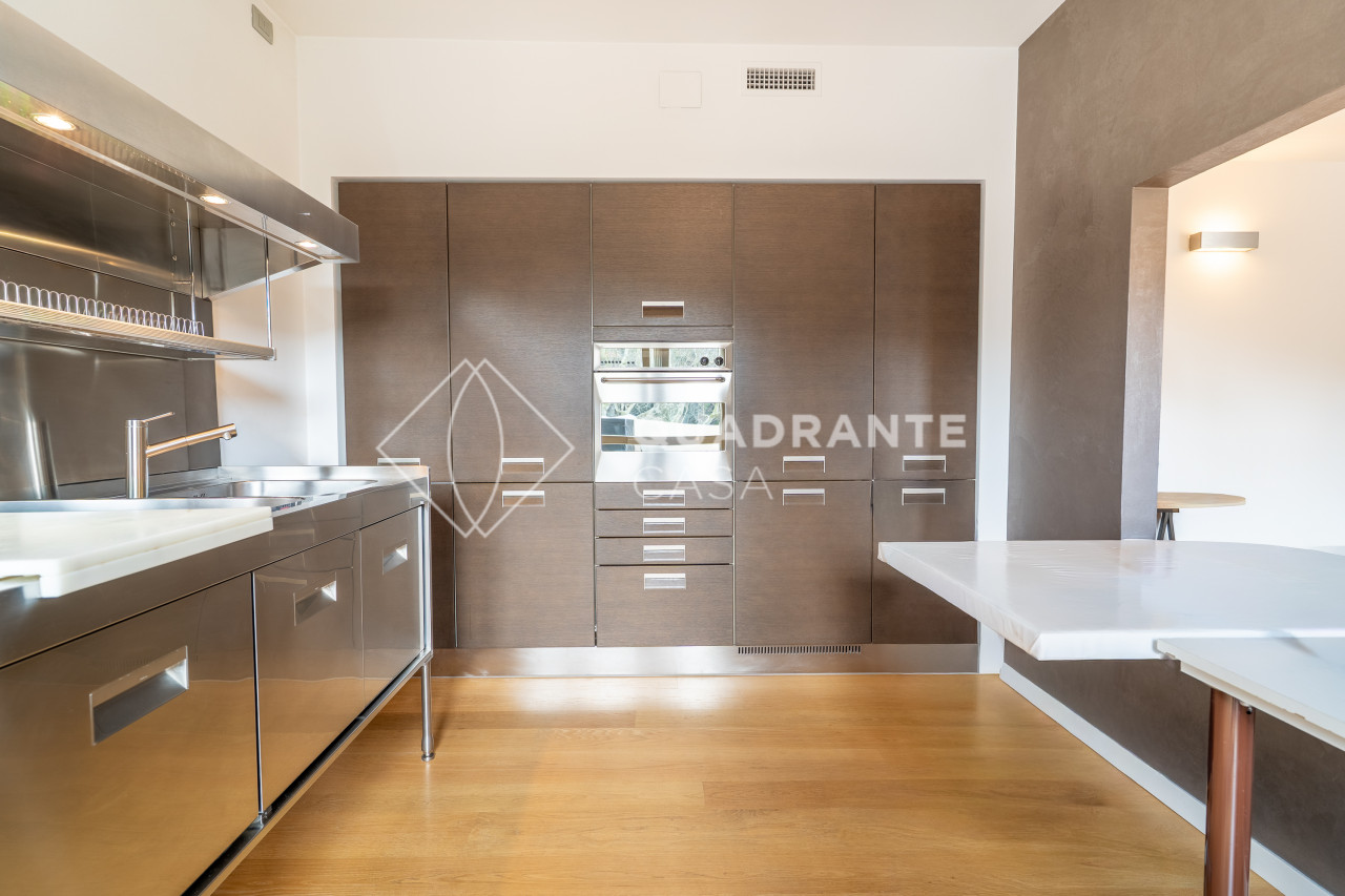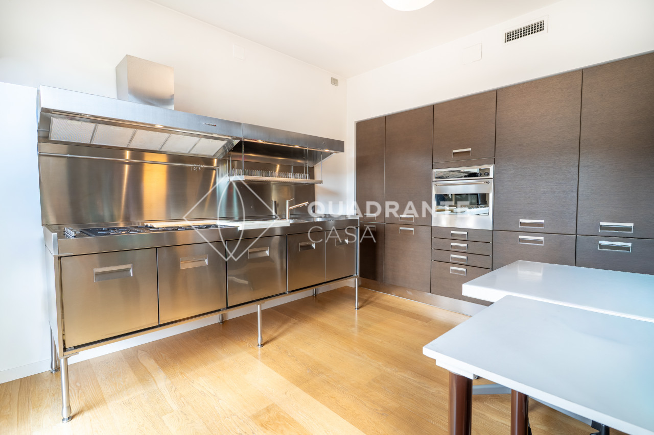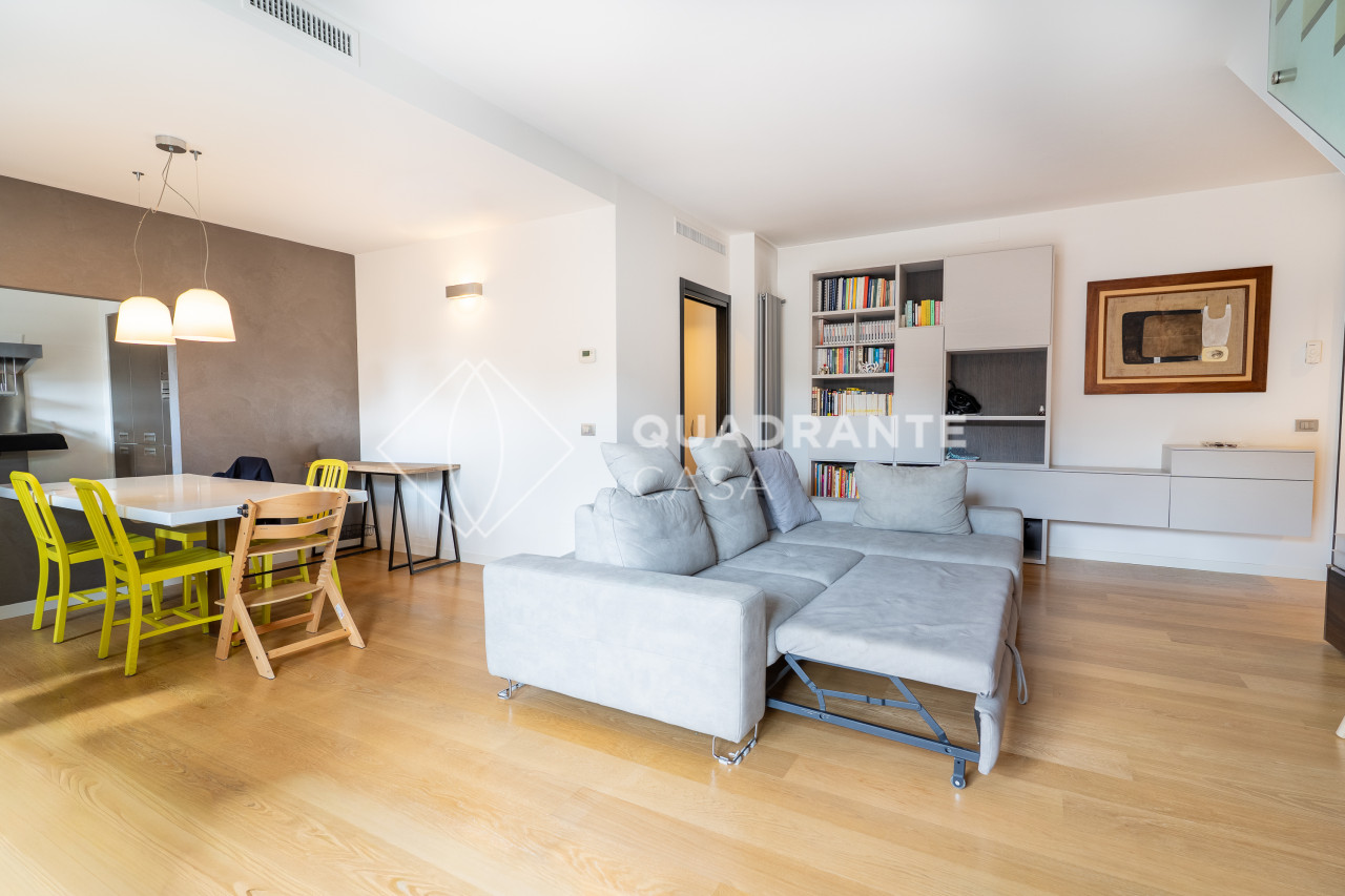 L’appartamento si distingue per gli ambienti luminosi e moderni: il soggiorno open space è caratterizzato da ampie vetrate che affacciano su una zona verdeggiante, pavimentazione in parquet chiaro e una raffinata scala interna con parapetto in vetro. La zona living è arricchita da arredi su misura ed elementi di design contemporaneo che donano eleganza all’ambiente.