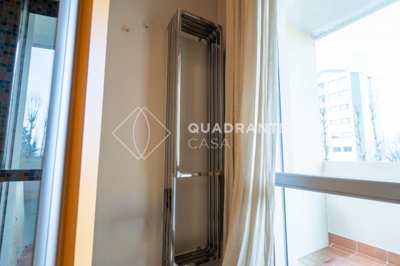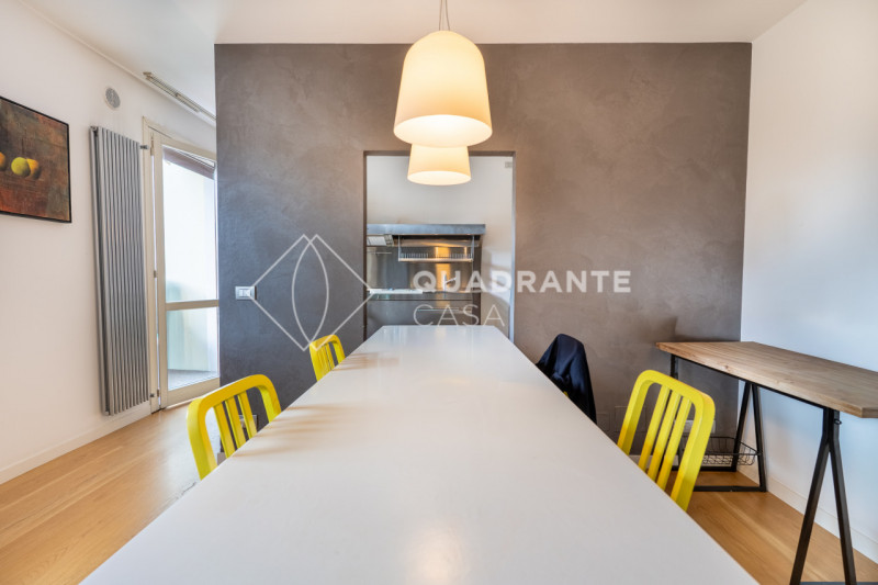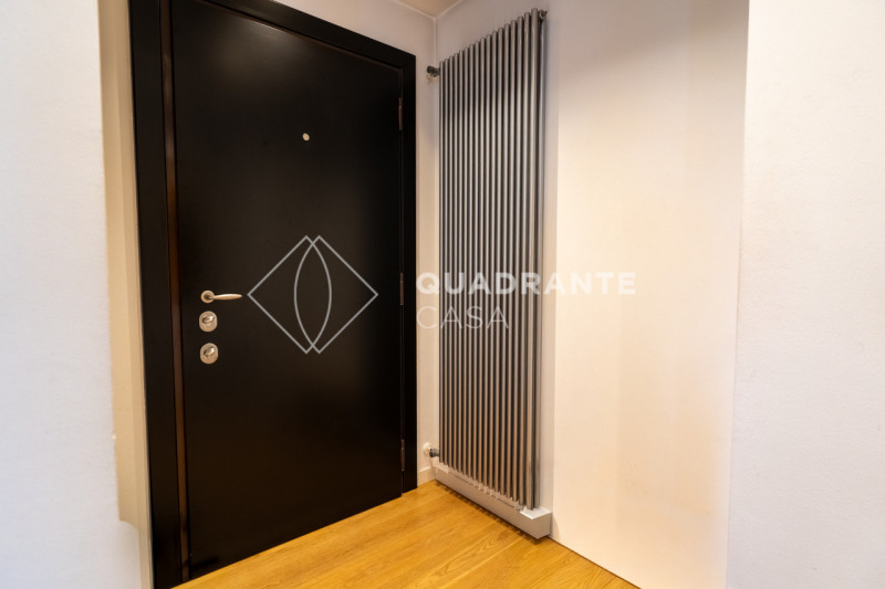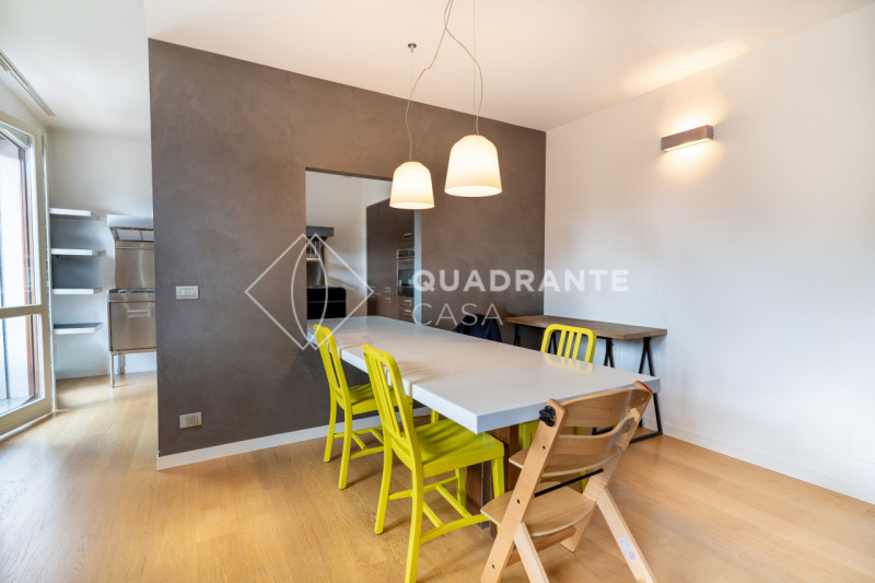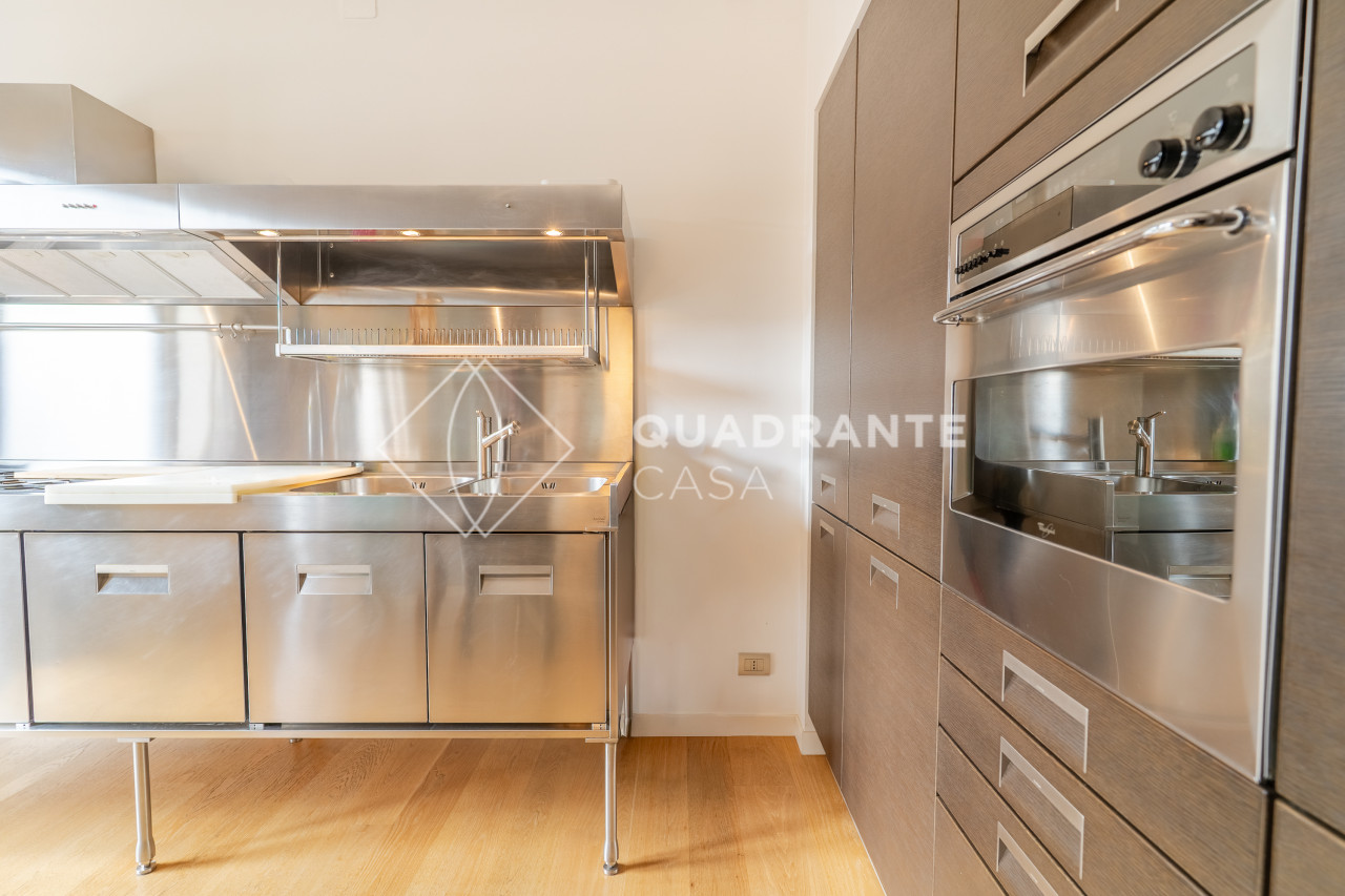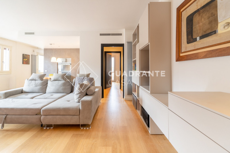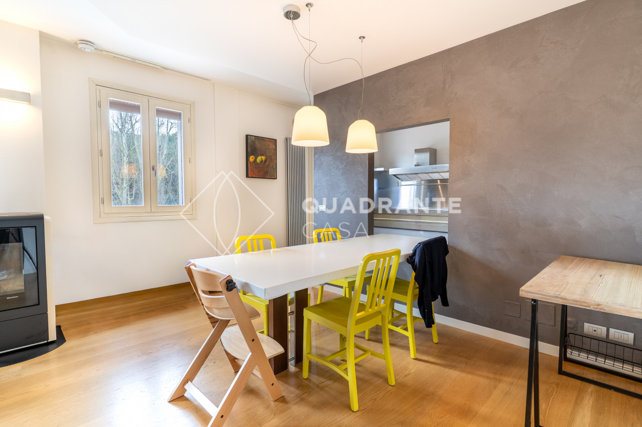 L’appartamento si distingue per gli ambienti luminosi e moderni: il soggiorno open space è caratterizzato da ampie vetrate che affacciano su una zona verdeggiante, pavimentazione in parquet chiaro e una raffinata scala interna con parapetto in vetro. La zona living è arricchita da arredi su misura ed elementi di design contemporaneo che donano eleganza all’ambiente.