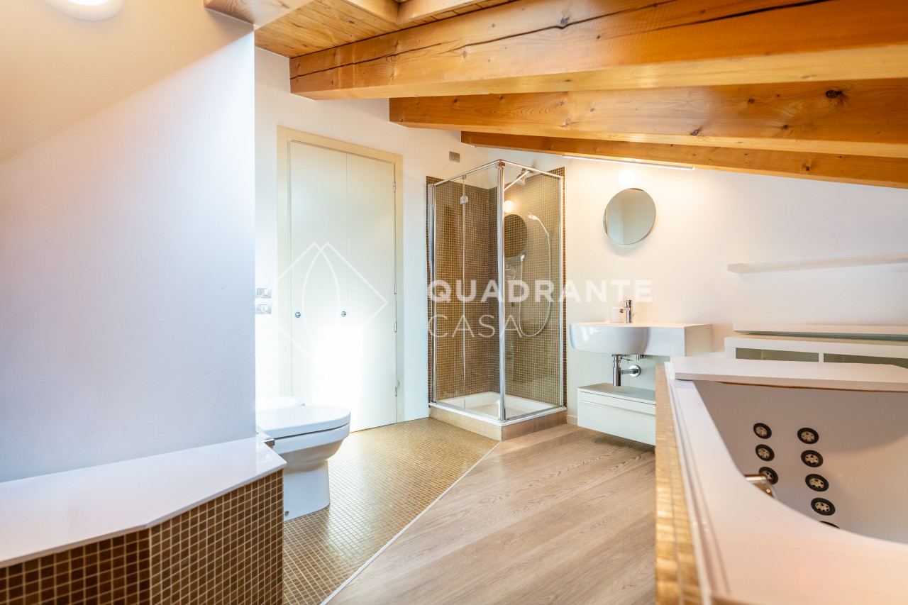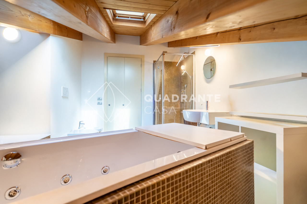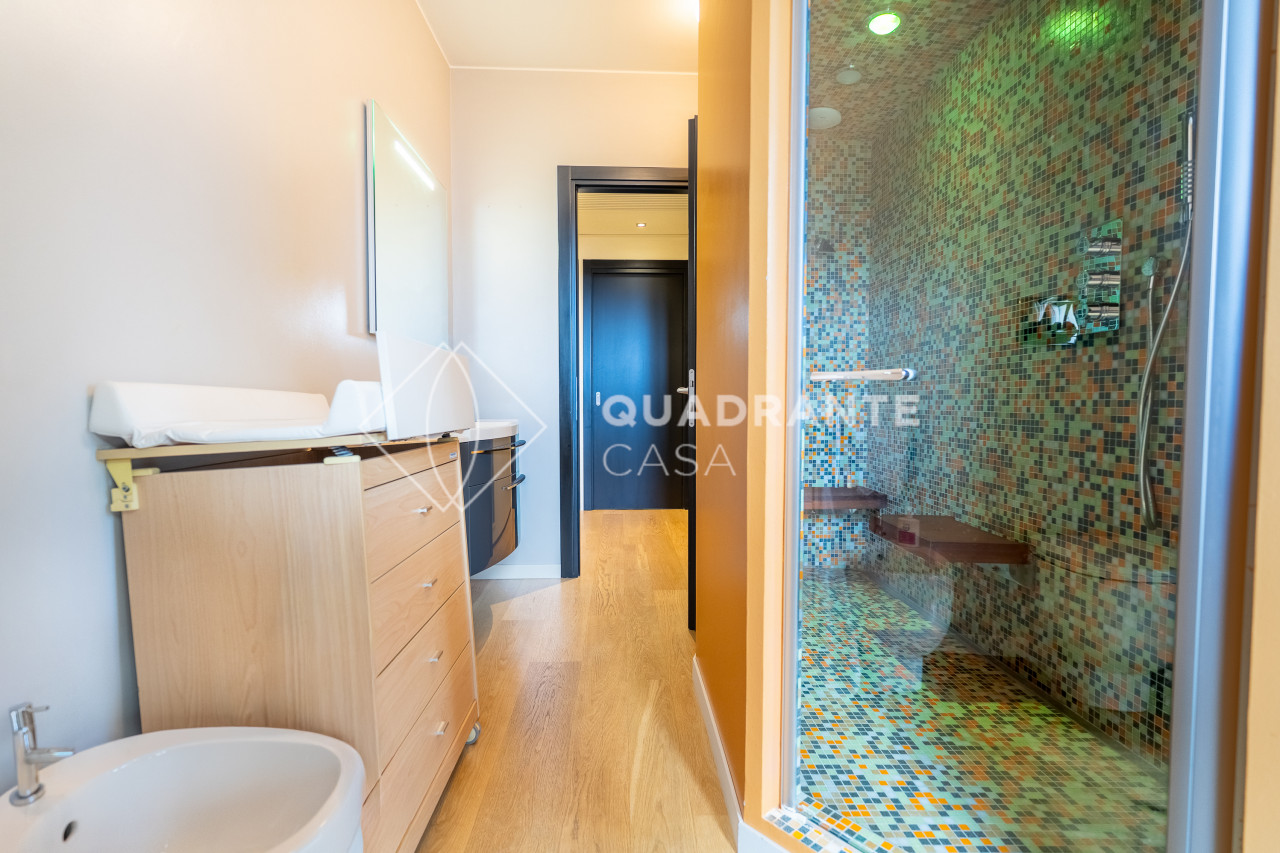 Dispone di impianto di ventilazione integrato nei controsoffitti per un comfort abitativo superiore; tra le dotazioni spiccano inoltre la termostufa moderna a pellet perfetta per creare atmosfera nelle stagioni più fredde, tende da sole e tapparelle motorizzate e due bagni dai dettagli ricercati – uno dei quali include uno splendido bagno turco rivestito con mosaico Bisazza.
