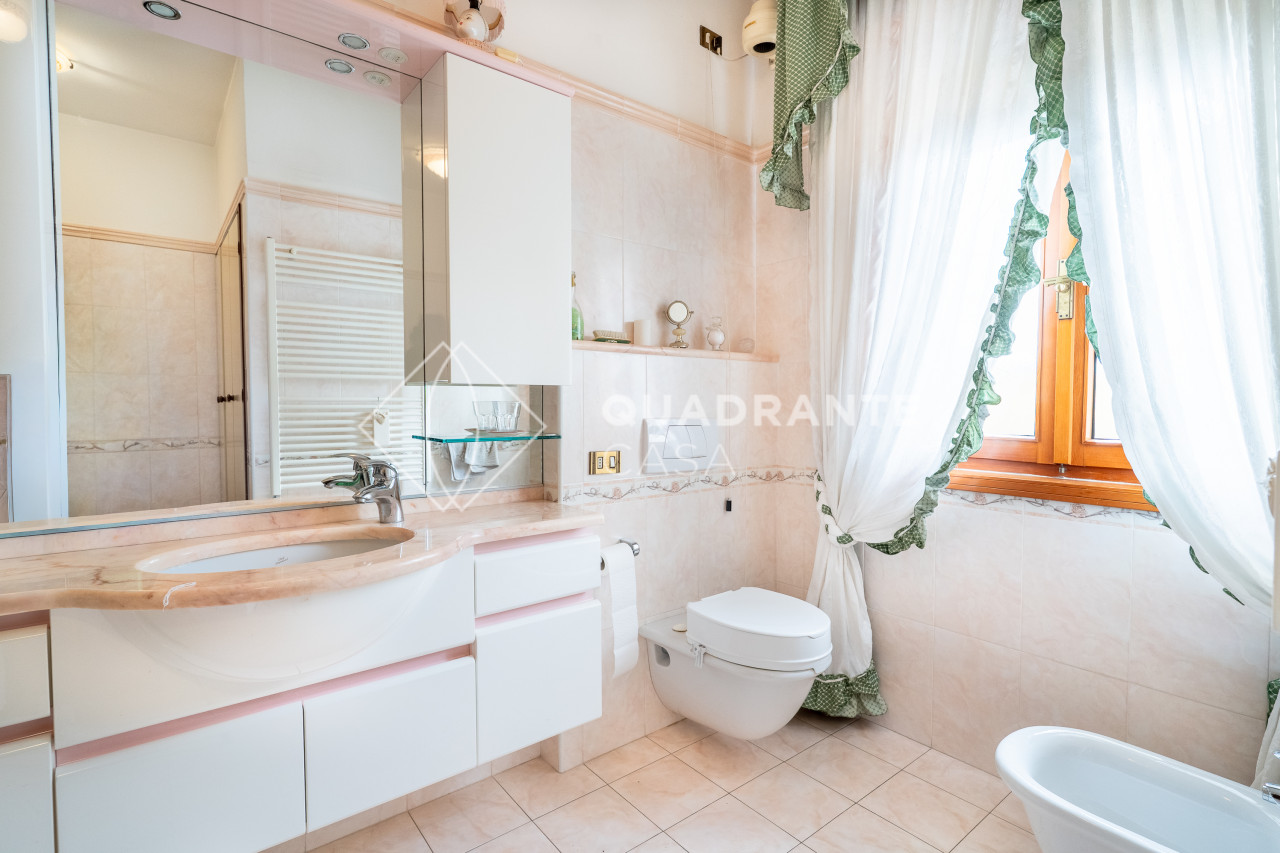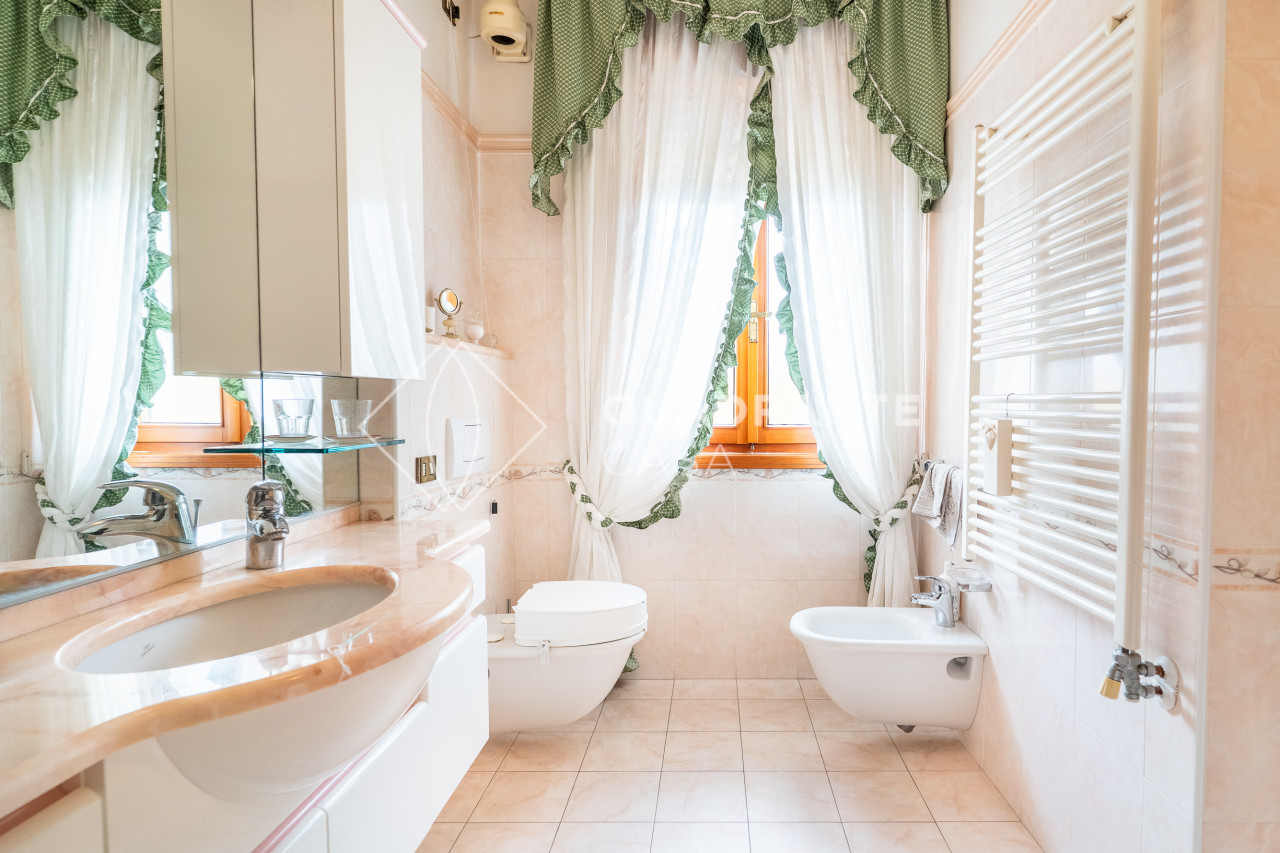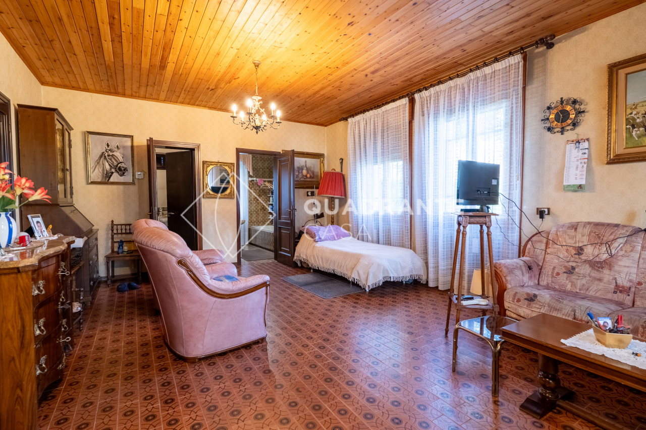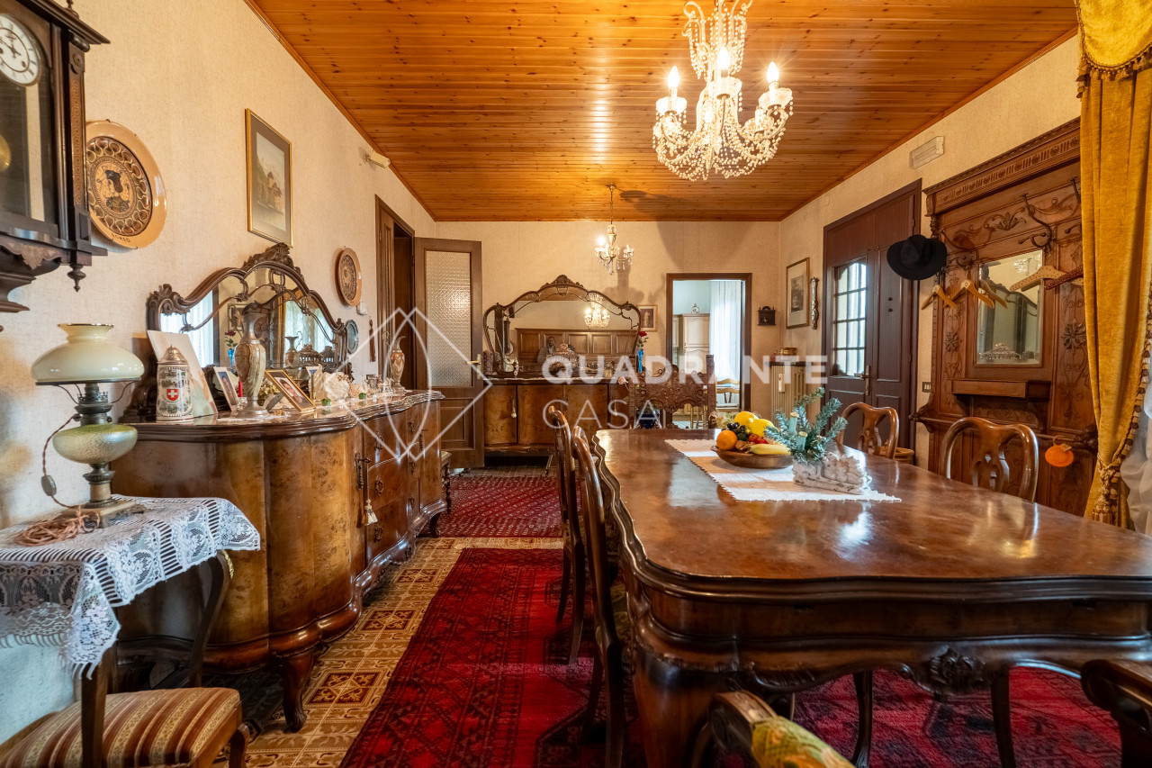 All’interno della villa – sviluppata su una superficie commerciale di circa 360 mq (518 mq calpestabili) – troviamo ambienti ampi e accoglienti caratterizzati dall’eleganza degli arredi artigianali, soffitti rivestiti in legno naturale e dettagli architettonici ricercati come lampadari classici a goccia che donano luce agli spazi principali. Il doppio soggiorno offre zone living luminose con grandi finestre panoramiche sul parco esterno ed un caminetto angolare; la sala da pranzo (30mq) colpisce per l’atmosfera raffinata creata dai tappeti persiani originali abbinati a mobili antichi restaurati.